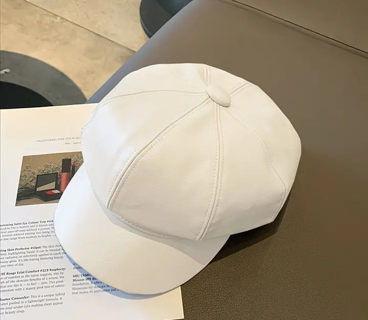 Elevate your look with this chic cream-white leather French beret, a sophisticated blend of Parisian style and modern edge. Its classic round silhouette molds comfortably to the head, giving you that effortless “French-girl” finish. The cream-white shade makes it a timeless neutral—easy to pair with fall layers, winter knits, or crisp year-round fashion. Perfect for fashion lovers who enjoy bold simplicity, this Beret is featured this week for its standout elegance and its ability to turn even the simplest look into a style moment. A must-have Hat On Feature—eye-catching, chic, and unmistakably refined.